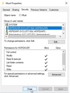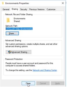 We do the same steps on the “C:\Environments” folder, to have a share called \\V-CLUST-SQL\Environments :