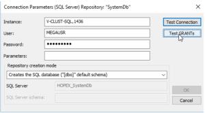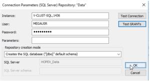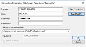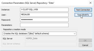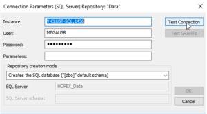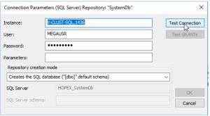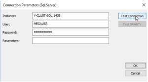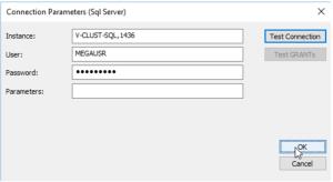 Provide the instance name, and the credentials of the „MEGAUSR“ native account. Then click „Test Connection“: