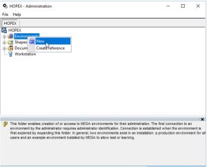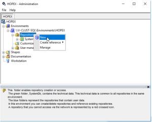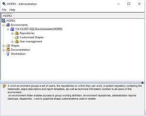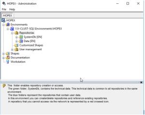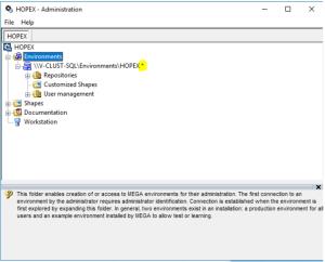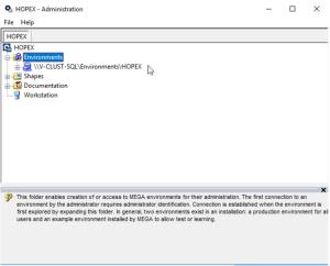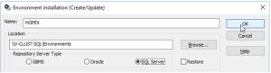 Put the name of the environment (in our case “HOPEX”), the location of the folder (\\V-CLUST-SQL\Environments) to be created, its type (SQL Server), and “OK”: