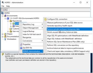 4. Right-click each repository, starting with the SystemDb : choose « RDBMS Administration », then « Remove Private workspace temporary data »