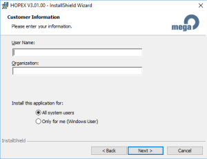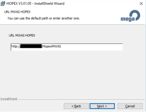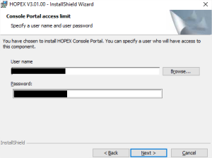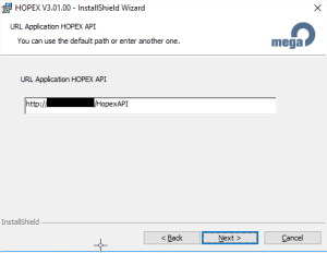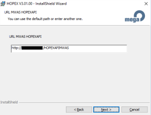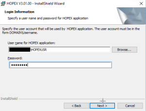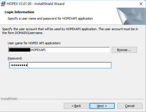 7. Enter the username and password of the Windows User for Mega HOPEXAPI, the second account that needs to be used in case you deploy the web services part: