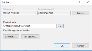 Remark: if you plan to install the web components in a different location than “C:\inetpub\wwwroot”, you need to first configure the root directory of the website where you will install it. Here, an example for the “Default Web Site”:
