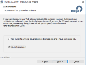 4. Choose to activate use of SSL/TLS or not. SSL/TLS is highly recommended; however, it requires some prior configuration of IIS (see Prerequisites section). Moreover, do not choose “Yes” unless the certificate is deployed in IIS. Otherwise, the installation will roll back.