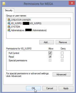 The impersonate acount is normally included in the “IIS_IUSRS” local group, and as stated before, that can contain the account that runs the “Mega Site Service Provider”.