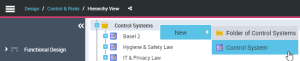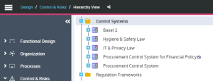 The different classifications (risk factors, risk types, control types) associated with a control system are accessible from the control system dialog box and from the Conception > Control & Risks > Hierarchy View pane.