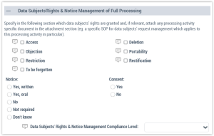 Data Subjects' rights and notice management Compliance level drop-down menu.