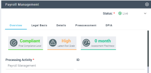 The information displayed here takes into account the assessments made through pre-assessments and DPIAs. This dashboard is empty until the GDPR team starts assessing the processing activity.