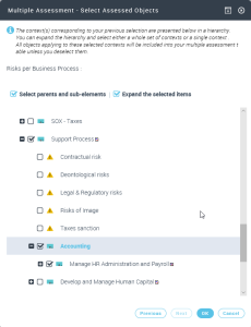 In the above example, if you selected the "Accounting" process, all risks and context objects located at a lower level are selected, as well as all parent context objects up to the tree root.