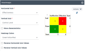 Find below an example of control assessment Heatmap report. From the selected characteristics (effectiveness and control level in this example), this report offers a graphical representation of results.