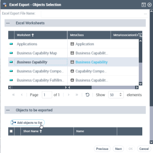 7. In the Excel Worksheets section, select the type of object you want to export and, in the Objects to be exported section, click Add objects to list.