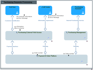 The following diagram describes the structure of the logical application system "Purchase request processing" offered to customers.