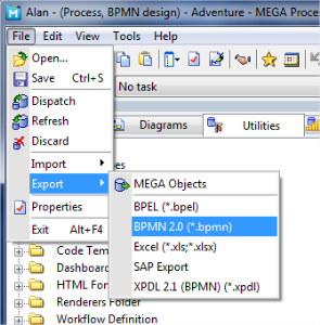 The MEGA BPMN export project aims at exporting workflow definitions as BPMN files so that workflows modeled in MEGA can be used by other BPMN modeling tools or workflow engines.