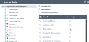 The Views and Details window details presents a list of views (object types to be displayed) which varies according to diagram type.