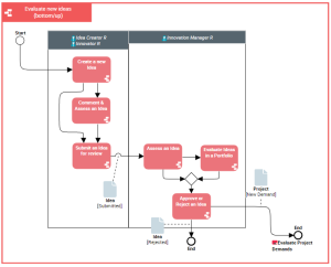 • Descending: the innovation manager can organize an ideation campaign, which involves the different stakeholders, on a particular subject (e.g.: a business capability). See also