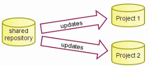 Models are created in a single repository. They are then used in projects, each of which results in creation of a repository.