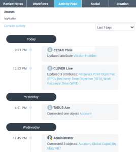 In the activity feed on an object, modifications appear in chronological order (with the most recent at the top) and by user, and according to the granularity defined (the last 7 days by default).
