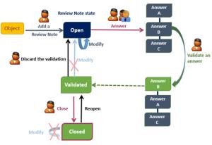 The diagram below presents the actions linked to the states of a review note and the elements that participate in the review note.