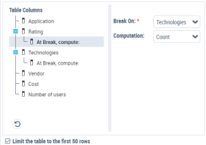 Example 1: from a Report DataSet with the "Application Technologies" definition, for the grouping on the "Rating” column, at the break, in the upper field select: "Technologies" and in the lower field select: “Count" to display in the break the number of technologies contained in the grouping.