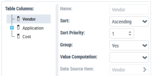 Example 2: from a Report DataSet with the "Application Technologies" definition, for the "Vendor” column, in the Group field, select “yes” to group the applications according to their vendor.