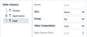 Example 2: from a Report DataSet with the "Application Technologies" definition, for the "Application” column, in the Value computation field, select "Count" to display the number of applications by "Vendor" and for the "Cost” column, in the Value computation field, select "Sum" to display the sum of costs per "Vendor".