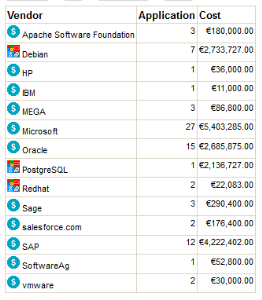 The report result presents the Vendors sorted in alphabetical order and for each vendor specifies the number of applications and their total cost