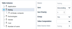 Example 1: from a Report DataSet with the "Application Technologies" definition, for the "Rating" column, select "Descending" to sort the applications by rating level, from the highest scored to the lowest scored.
