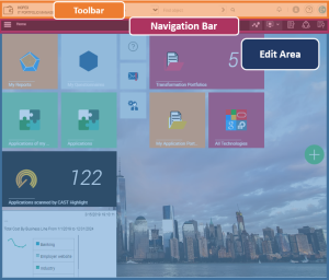 The edit area is used to perform business and technical operations proposed by the selected Solution.