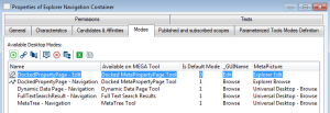 For example, in the HOPEX Explorer desktop, where the browse mode is the default the “Explorer Navigation Container” includes the “Docked MetaPropertyPage Tool” which is editable in Edit mode and not editable in Browse mode.