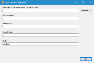 8) Enter all the fields: Path to the macro folder (under Hopex/System folder), EnvironmentId and RepositoryId that you want to target, Security Key given during your installation, and machine name (DNS).