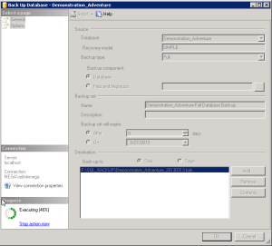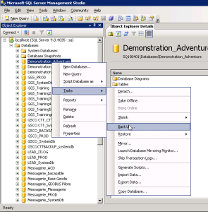 3. To make a backup of the source database (for example, Demonstration_Adventure), right-click the database and select Tasks > Back Up.