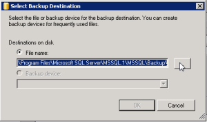 6. Choose a location where you know that the user you authenticated with, has rights to write on. In this example in « F:\SQL_BACKUP » of the F drive, and give the name of the backup file to create (here Demonstration_Adventure_20130313.bak).