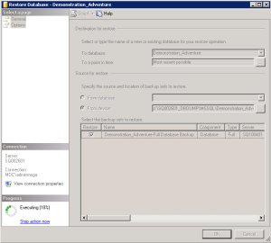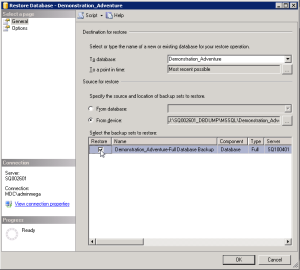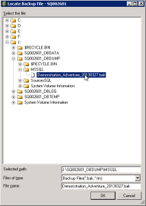 Otherwise, browse the folders to get to it. Then, click the .bak file that you just copied on the server (for example: « Demonstration_Adventure_20130327.bak »).