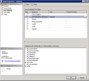 14. In the Login Properties - <login> window, select User Mapping page, and select the Map corresponding to the database lin you just restored.