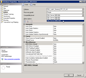 2. Select the Options page, in the Compatibility level drop down list select the appropriate version (for example « SQL Server 2008 (100) »).