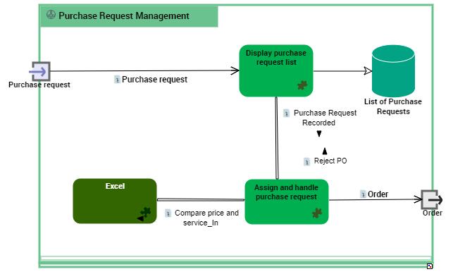 The scenario of application flow diagram below describes the "Purchase request management" application.
