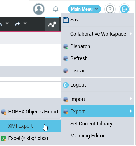 1. In HOPEX, select Main Menu > Export > XMI Export.