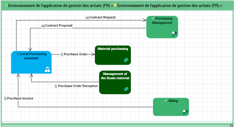 The diagram below describes the flows exchanged in the context of the "Purchasing Management System" application.