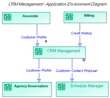 An "Ascendix" software package sends customer profiles to the Customer Relations Management application, which makes these profiles available to the Agency Reservation application. The history of credit granted to customers is sent to the CRM application by the Billing application, and contract proposals are sent to the Sales Schedule Manager.