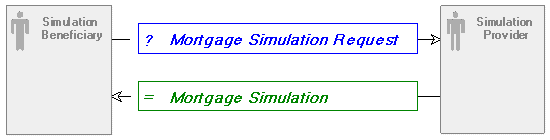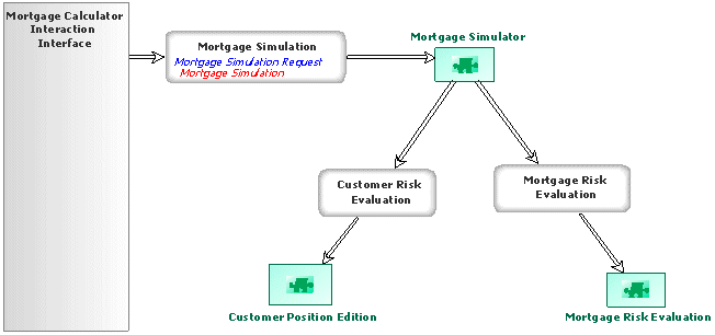 Interactions make it possible to describe the service interfaces, i.e.: all the input and output messages that they need to take into account. In our example, the Mortgage Simulation interaction comprises the two messages: Mortgage Simulation Request and Mortgage Simulation.