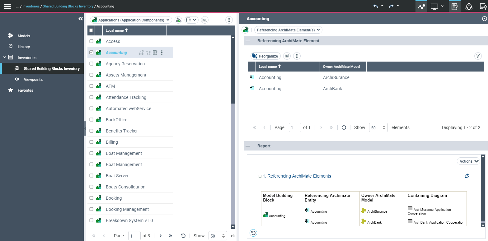 The Referencing ArchiMate Element(s) report, enabling a view of the use of a component across the various ArchiMate® models.