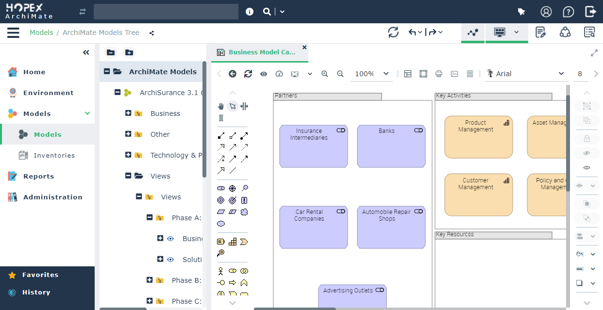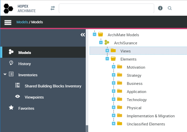 • ArchiMate® Models and their elements in tree view (see Models pane and ArchiMate Model folder),