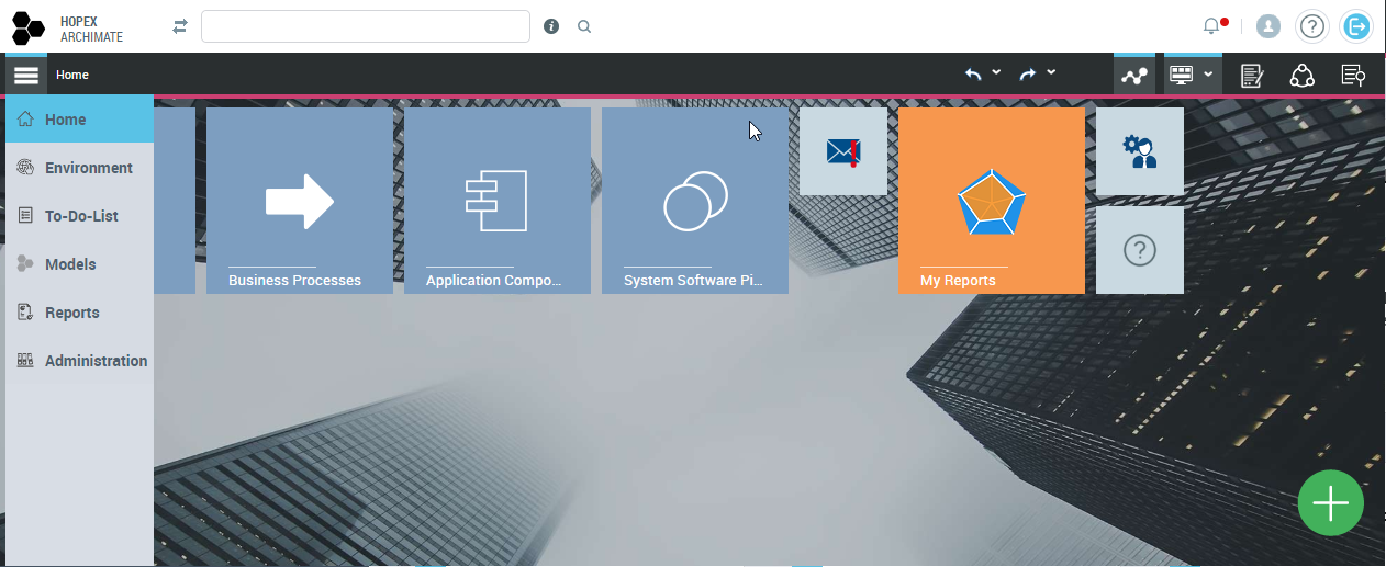 From the Home pane, tiles provide access to main elements inventories across models: Capabilities, Business Processes, Application Components, System Software Pieces or Reports.