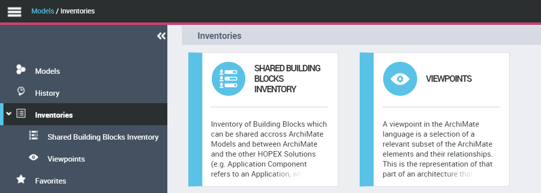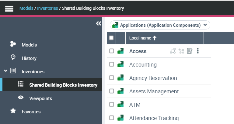 • The Shared Building Blocks Inventory tile: to access to the objects that can be shared across ArchiMate® Models with other HOPEX products. For example, Applications inventory is shared with HOPEX IT Portfolio Management and can be used by Application Components in an ArchiMate® Model.