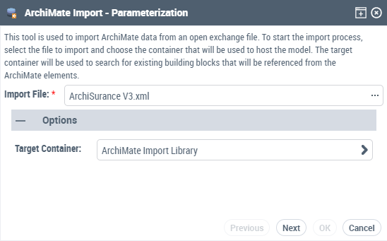 2. In the Import File of the ArchiMate Import - Parameterization dialog box, specify the path of the file to be imported.