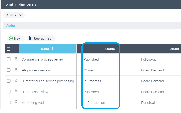 2. In the list of audits of the audit plan, click the title of the Status column.