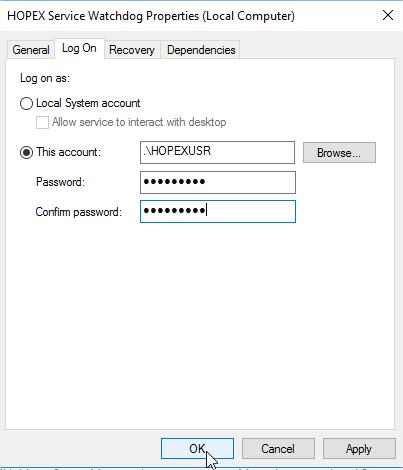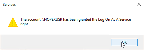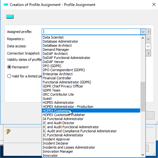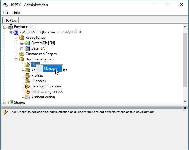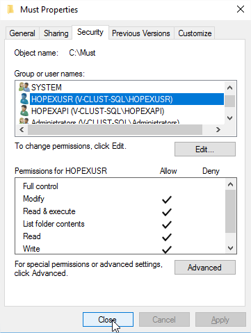 6. In the Security tab, confirm that the “HOPEXUSR” and “HOPEXAPI” users have read/write access: