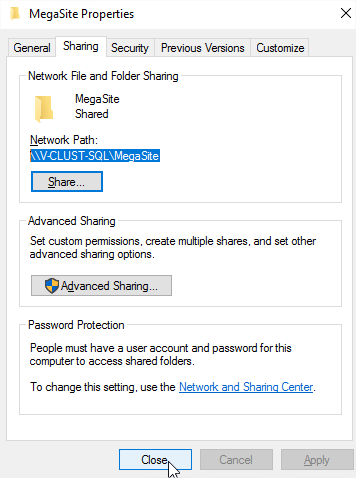 Eventually, the share that will host the clustered MegaSite file on folder “C:\MegaSite” to have the share \\V-CLUST-SQL\MegaSite :