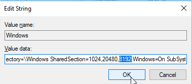 Find, in the string, the part called “SharedSection”, and update the 3rd number to 8192. The number is in KB, so that means that it will be set to 8MB: