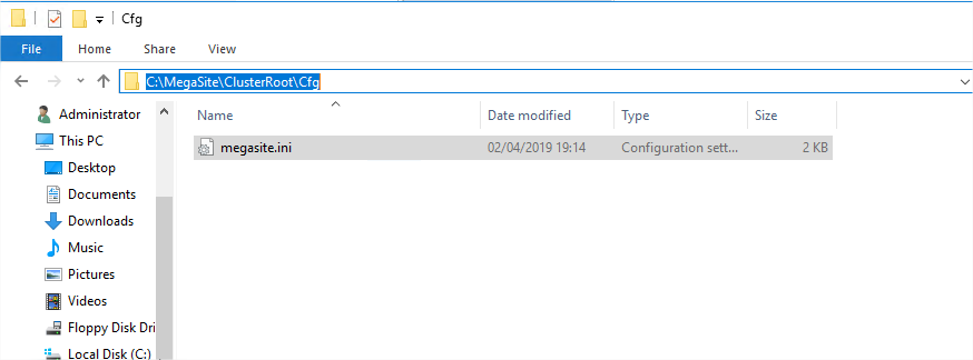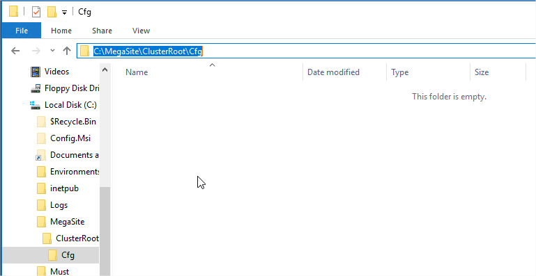 To do that, we will first create, on the RDBMS server, subfolders to the „C:\MegaSite“ folder. Two levels called „\ClusterRoot\Cfg“: