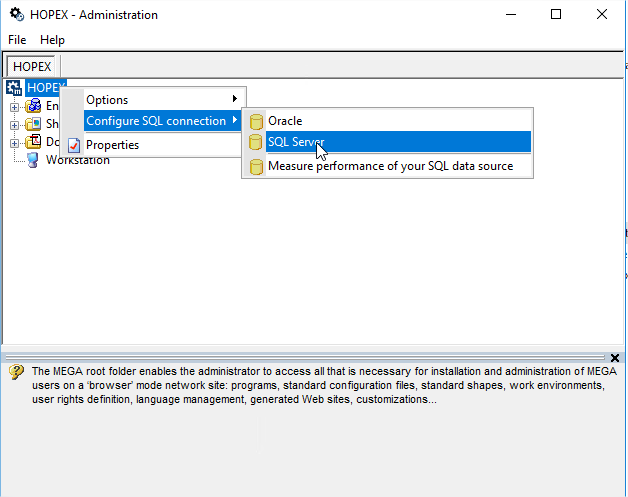 2. Select HOPEX > Configure SQL Connection > SQL Server: